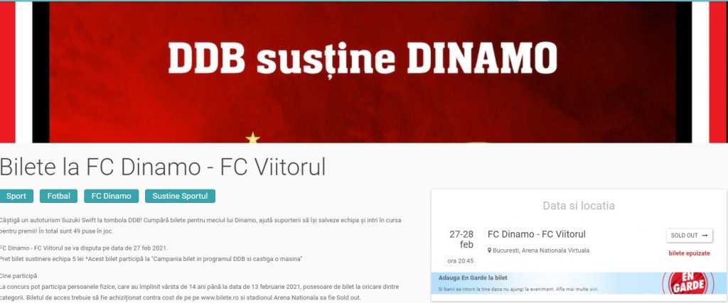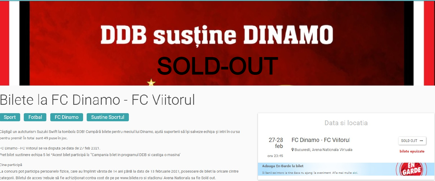 Odata cu anuntul ca urmeaza sa fie oferita la tombola o masina Suzuki Swift, ritmul vanzarilor de bilete a crescut incredibil si acum, cu cateva ore inainte de meci, avem din nou SOLD-OUT! Astazi, in doar cateva ore, s-au dat peste 10 000 de bilete si este dovada clara ca atunci cand vine vorba de suflarea dinamovista, nu exista o limita, nu exista „nu se poate”.