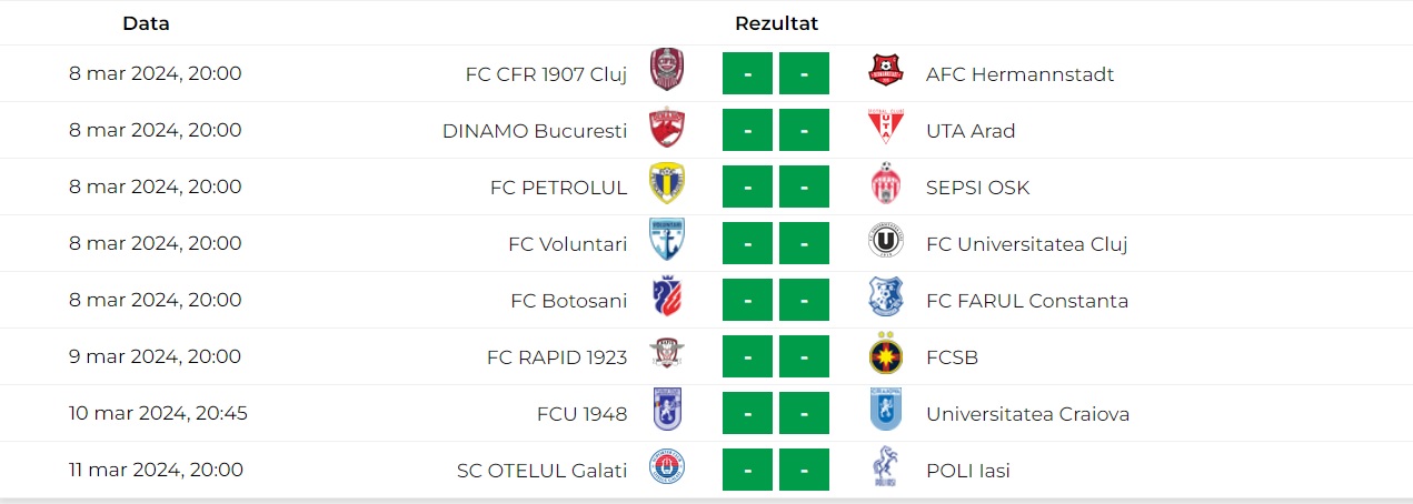 “LPF a programat vineri, 8 martie, 5 meciuri. Toate se vor juca de la aceeași oră, având în vedere implicările pentru stabilirea clasamentului final. Pe site-ul Ligii, partidele au ora de start 20:00, dar pot exista modificări viitoare. La fel și în cazul celorlalte partide.”, a transmis LPF.