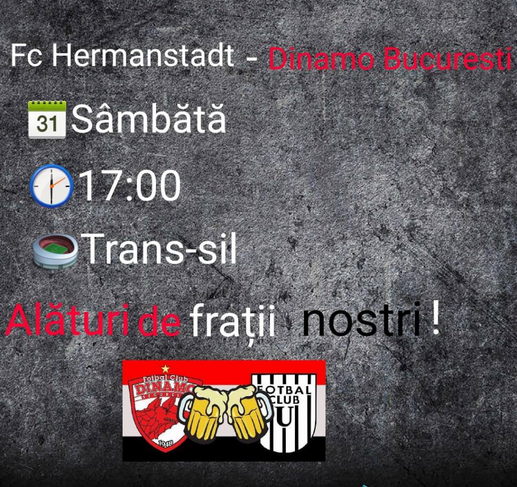 Mai mult de atat, suporterii de la U Cluj au anuntat si ei ca vor veni sa ii sustina pe dinamovisti, dupa cum se stie, cele doua galerii sunt infratite si acest lucru se vede mai ales in momentele grele. M-a bucurat succesul clujenilor la debutul lui Bogdan Lobont pe banca tehnica, au facut un pas important catre promovare si sper ca la anul sa ne revedem IN PRIMA LIGA!