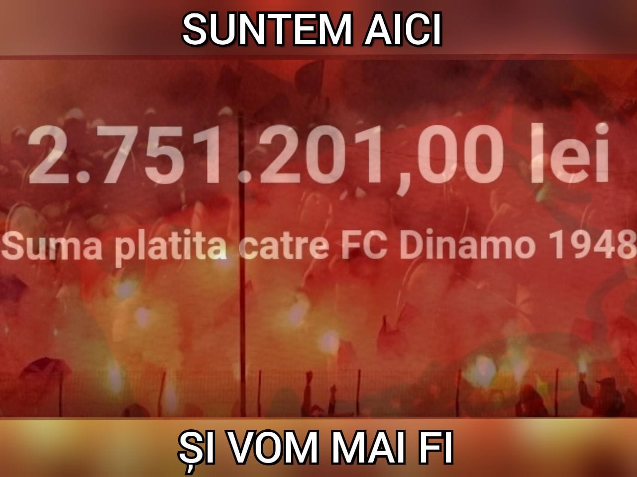 Am transferat in total 2.751.201,00 lei catre FC Dinamo 1948. Bani adunati cu greu de catre suporteri si dati Clubului in cele mai delicate momente. Prin aceste sume s-au platit salariile, datoriile administrative si S-A OBTINUT LICENTA PENTRU LIGA 1.
