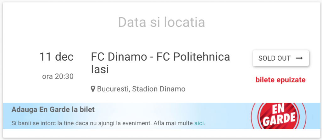 In acest moment, apare SOLD-OUT la biletele puse in vanzare pentru meciul dintre DINAMO si Poltehnica Iasi. Dupa cum spuneam de dimineata in avancronica meciului, la 07:00 mai erau aproximativ 1700 de bilete ramase, iar acum toate au fost cumparate de suporteri.