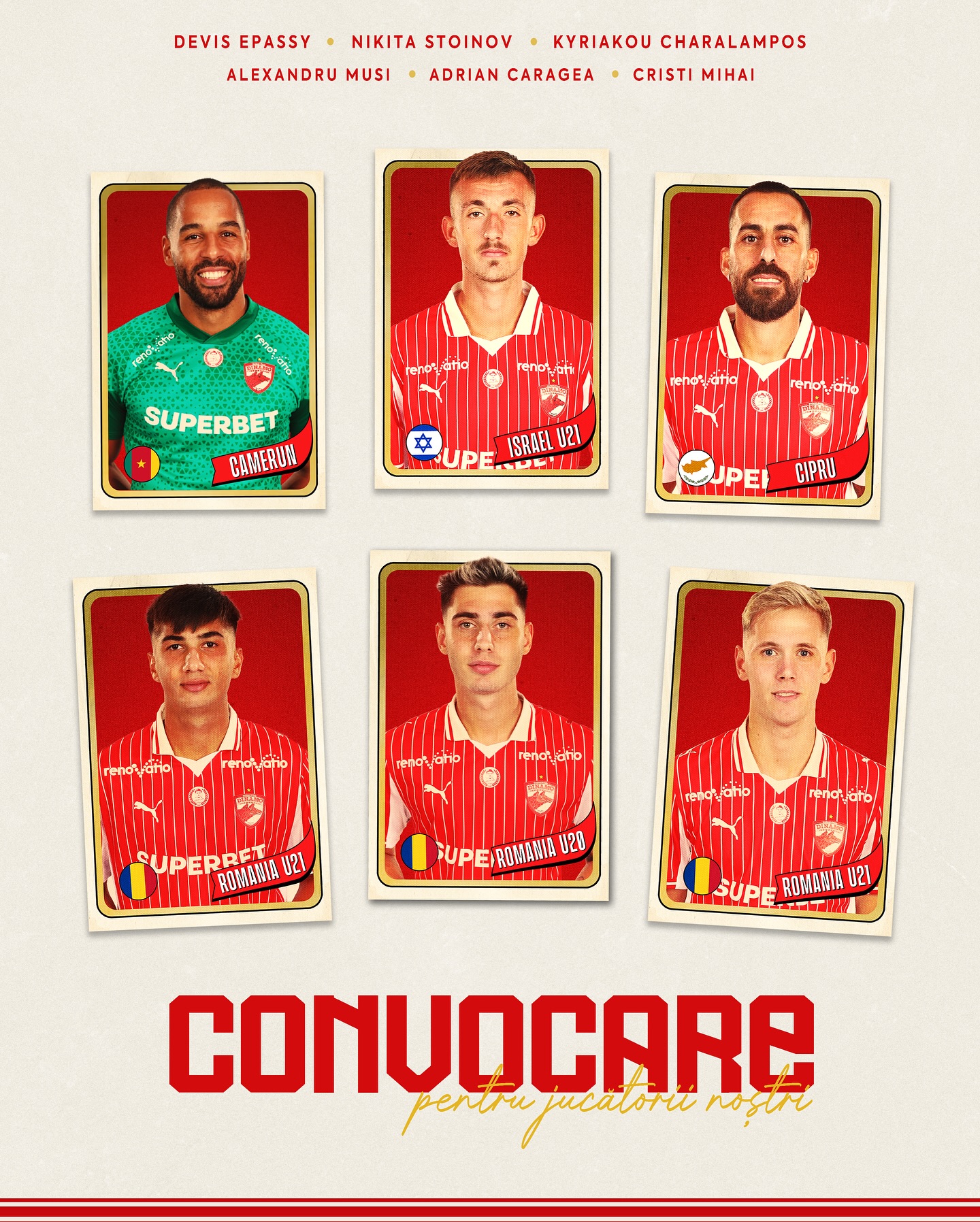 Alexandru Musi și Cristi Mihai la România U21, Adrian Caragea la România U20, Devis Epassy la Camerun, Charalampos Kyriakou la Cipru și Nikita Stoinov la Israel U21 sunt cei șase dinamoviști care își vor reprezenta naționalele.