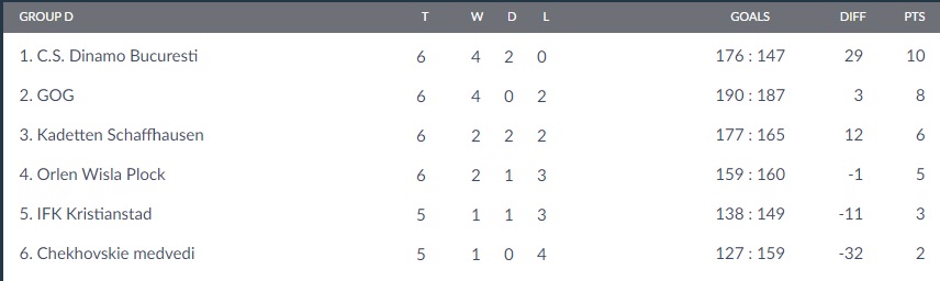 Dupa 6 meciuri disputate, Dinamo are 10 puncte (4 victorii si doua rezultate de egalitate) si este pe primul loc in grupa. Surpriza a venit aseara in Elvetia, acolo unde Kadetten Schaffhausen, o echipa credidata cu putine sanse de a merge mai departe, a spulberat pe GOG (40-28) si situatia in grupa s-a schimbat putin.