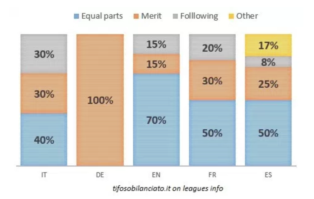 In cele mai importante campionate ale Europei se iau in considerare mai multe criterii atunci cand se impart banii din drepturile TV, nu doar criteriul performantei sportive, doar in Germania se ia in considerare clasarea la finalul sezonului.