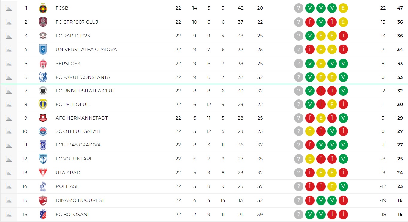 Etapa cu numărul 23 începe astăzi cu meciul dintre Farul Constanța și FCU Craiova. Farul Constanța este în revenire de formă, a învins rundă trecută în deplasarea cealaltă Craiova, 2-1, a urcat pe locul 6 și are 2 victorii și 2 rezultate de egalitate în ultimele 4 etape. Meciul din această etapă nu va fi unul ușor, echipa lui Mititelu a irosit 3-1 în deplasare în Giulești și a plecat fără vreun punct.