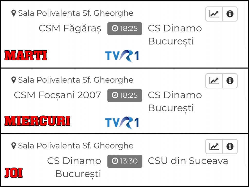 Dinamo evolueaza astazi, incepand cu ora 18:25, impotriva celor de la CSM Fagaras. Maine, de la aceeasi ora intalnim pe CSM Focsani, urmand ca joi sa dam piept cu CSU Suceva. Partidele de astazi si maine vor fi transmise in direct de TVR 1. Nu este deloc usor pentru jucatorii nostri sa evolueze in acest ritm, care pare intr-adevar infernal, probabil vor fi rulati toti jucatorii din lot, de aceea este extrem de important faptul ca Dinamo are un lot numeros si jucatorii sunt de valori apropiate.